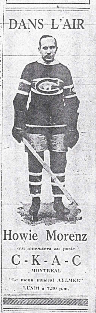 Late in the season, Morenz would be recruited to host “Le menu musicale AYLMER†on Radio station CKAC. The Aylmer Canning and Evaporating Company was formed in 1881, and over the course of the next decades became the well-known canner of vegetables and various soups. This advertisement is from La presse, 14 mars1931, p.50