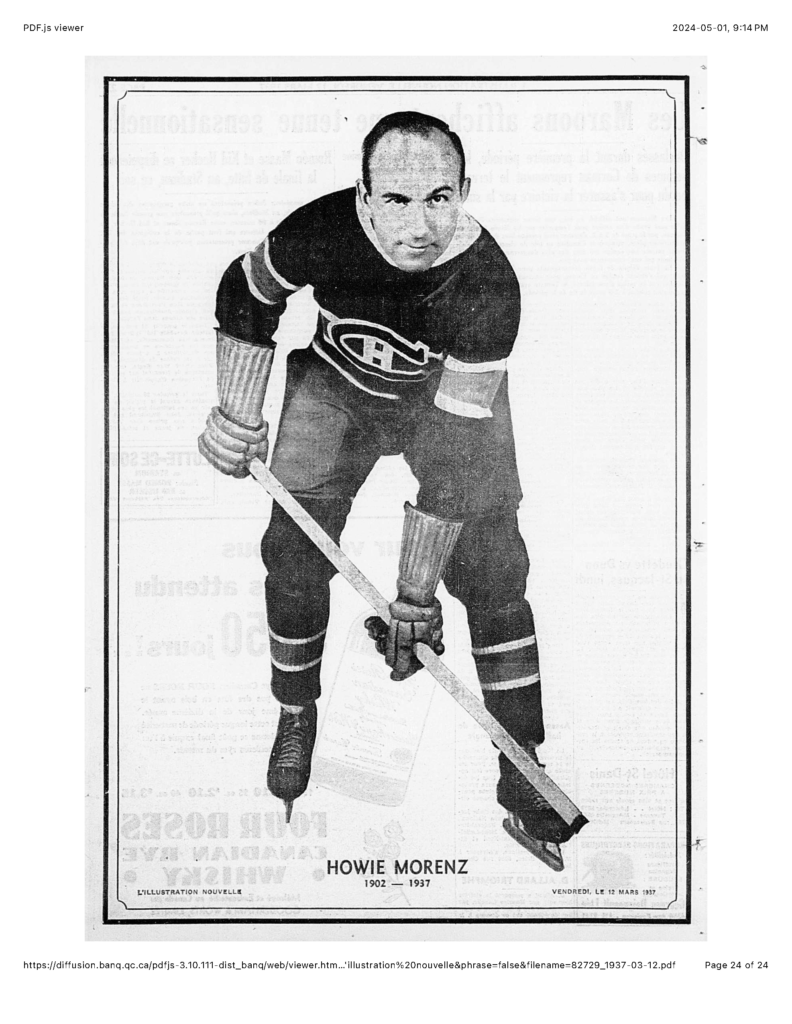 Morenz was always a glamorous figure. No one who saw him could ever forget him. Those were the days when Canadiens were almost more than a hockey team, something of the symbol of the dash and gallantry of a race, and to watch the magnificent Morenz leading the great line of Morenz, Joliat and Gagnon like a red wave to the enemy’s goalposts was an unforgettable experience.- Mike Rodden, The Globe, January 12, 1931, p.10, c.3 – 4