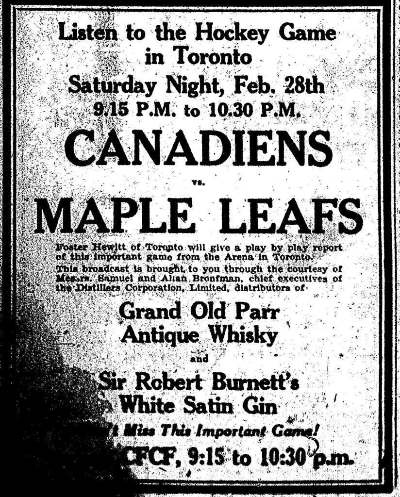 Foster Hewitt’s play by play was to be broadcast through the CFCF channel, courtesy of the Bronfman brothers. The Bronfmans and Distillers Corporation had actually arranged for a full series of broadcasts on CFCF from Toronto which included the Maroons’ games on December 18, January 8, and March 5, as well as the three Canadiens’ games on January 3, 17, and February 28: La presse, 17 decembre 1930, p.23, c.7 – 8.